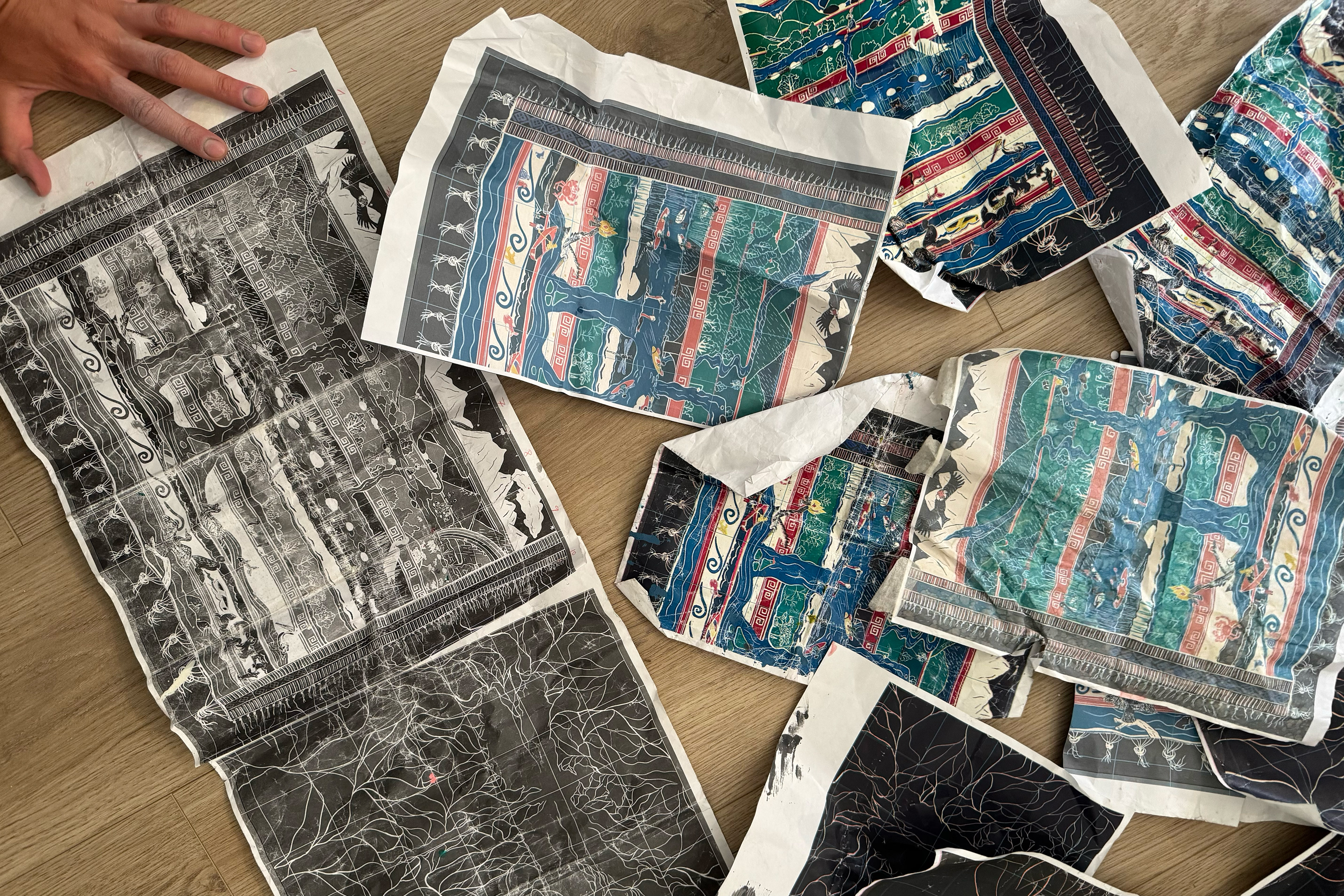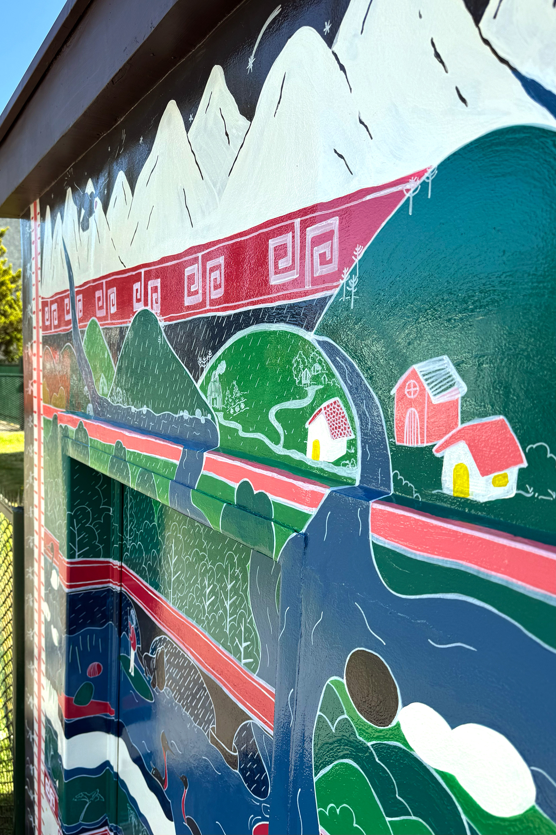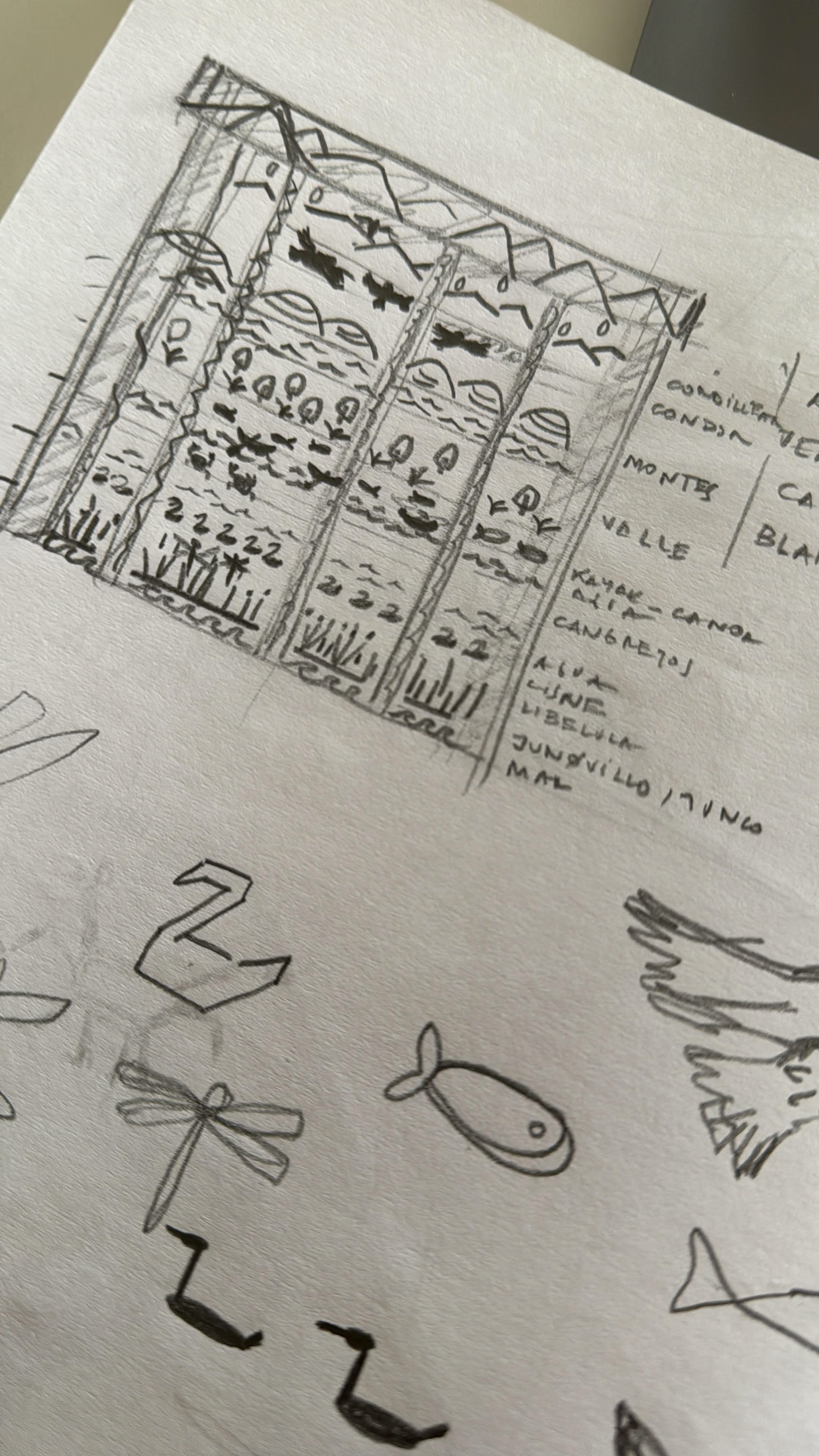 El agua como elemento esencial de la vida, interpretado a través del mundo textil, tan propio de la cultura y pueblos originarios. El huso de lana, herramienta esencial para hilar la lana, comienza el tejido, desdibujado al inicio, donde a lo lejos vemos una libélula dada por la ausencia de hilos. Esos hilos continua, y son parte del tapiz que ilustra el recorrido del agua, desde las montañas, al mar, pasando por valles, la ciudad de Valdivia, diversas especies nativas, y la relación de las personas con el agua como elemento que aúna aspectos de la vida, lo cultural y lo social.